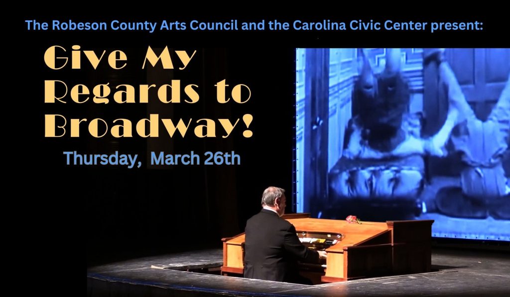 The Robeson County Arts Council and the Carolina Civic Center are excitedly teaming up to present “Give My Regards To Broadway!” Enjoy an evening of Broadway favorites on the theater’s Mighty Morton organ, performed by master of the keys Mark Andersen. In support of the Arts in Robeson County, join us for an enchanting evening featuring organ music, exquisite cuisine, a thoughtfully curated silent auction, and a lively theater singalong. Come sing with us and you get to be the star!